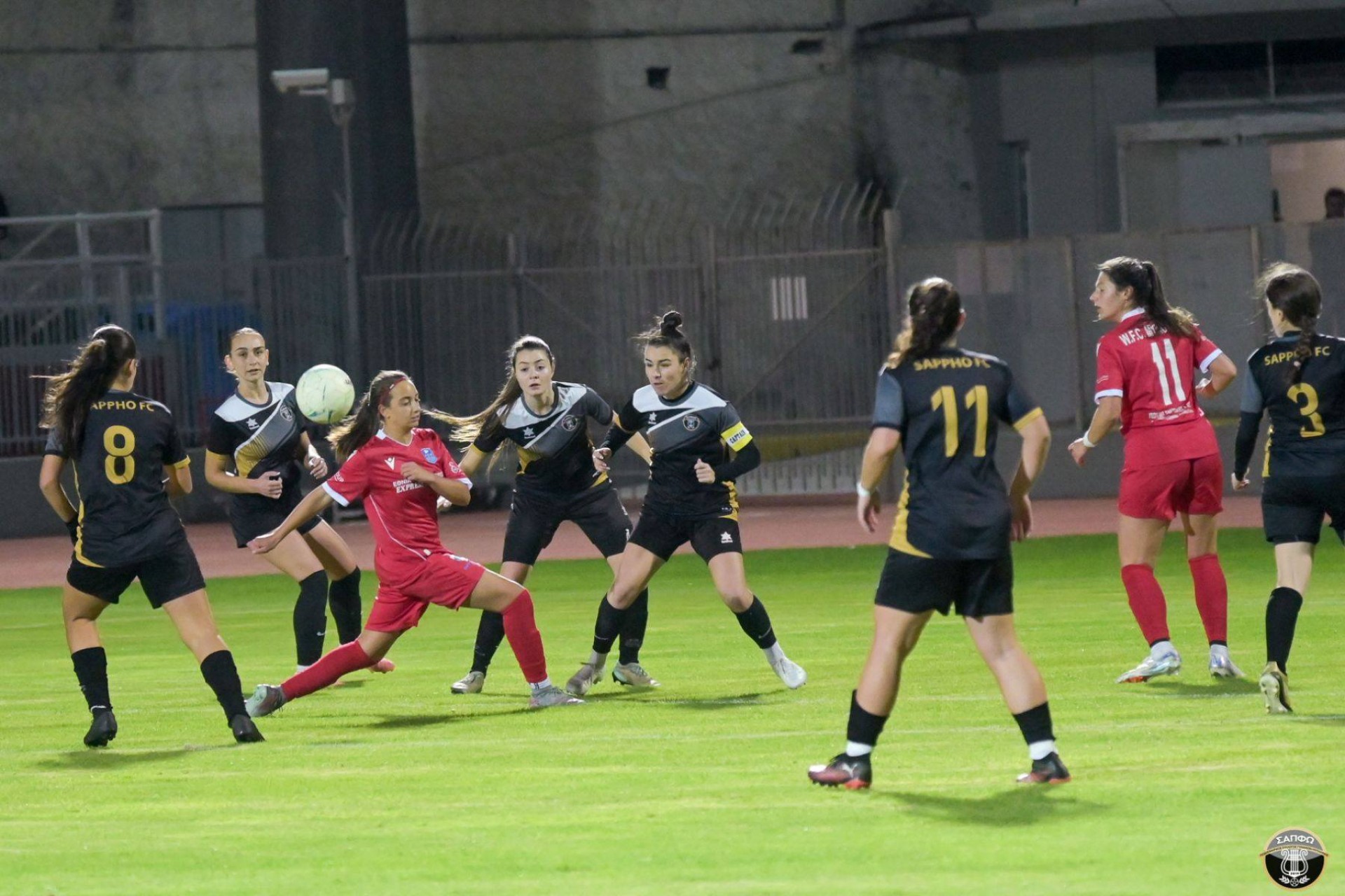 Η Σαπφώ από την πλευρά της που είχε αναγκαστικη αλλαγη στο 25' προσπάθησε να απειλήσει κυριως με μακρινά σουτ της Ασημίνου. Στο 21' ένα σουτ της Βούρου εντός περιοχής πέρασε πάνω από την εστία. Δύο λεπτά αργότερα η Τζάνη αποχώρησε από τον αγωνιστικό χώρο υποβασταζόμενη λόγω τραυματισμού, με την Γιαννη να την αντικαθιστά, κάνοντας ντεμπούτο μετά τον σοβαρό τραυματισμό της που την άφησε εκτός γηπέδων για μεγάλο διάστημα. Στο 31' η Μάλλιαρη σουταρε, όμως η μπάλα κατέληξε άουτ. Καλή ευκαιρία που δεν είχε ωστόσο ευτυχή κατάληξη καθώς η μπάλα «έξυσε» το κάθετο  δοκάρι, είχε και η Pasmakis, ενώ νωρίτερα η Ασημίνου με σουτ από μακριά αναγκασε την τερματοφύλακα να απομακρύνει με υπερένταση σε κόρνερ.