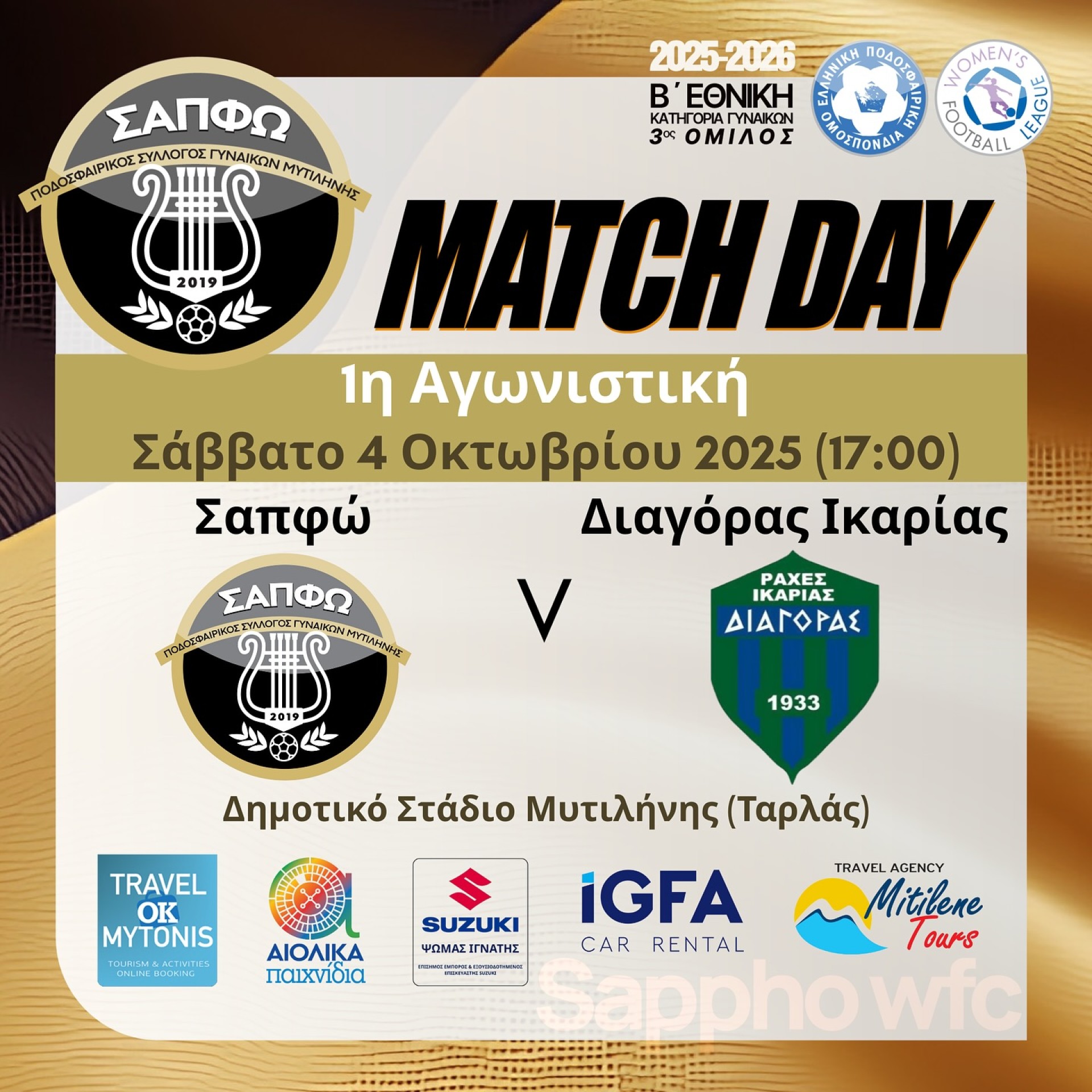 Ο αγώνας που θα ανοίξει την αυλαία του 3ου ομίλου θα διεξαχθεί στο Δημοτικό Στάδιο Μυτιλήνης το Σάββατο 4 Οκτωβρίου, με ώρα έναρξης στις 5 το μεσημέρι. Ο αγώνας θα μεταδοθεί σε Live Streaming από το κανάλι της Σαπφώ στο Youtube.